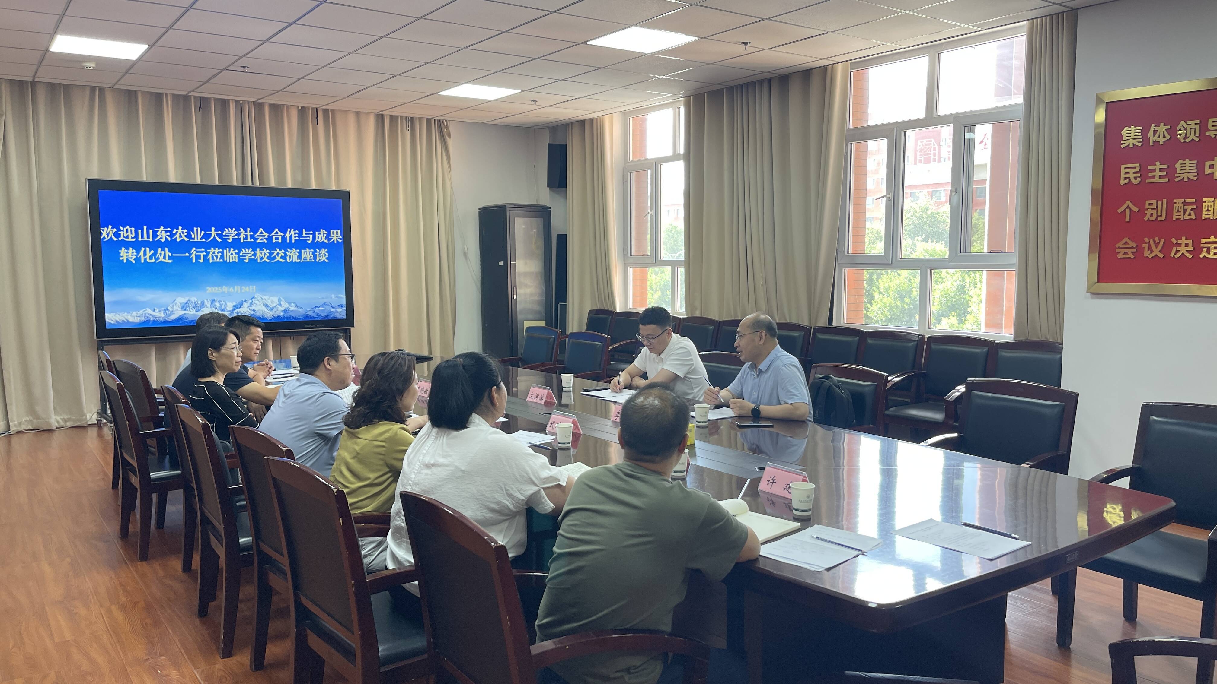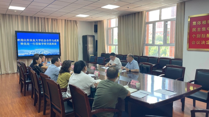 新疆农职大对山东农大社会合作与成果转化处一行的到来表示热烈欢迎,并详细介绍了学校发展面临的堵点、难点以及请求山东农业大学支持事项,希望在科研项目申报、人才互访交流以及科技成果转化等方面开展深入合作,助力新疆农职大办学水平显著提升。