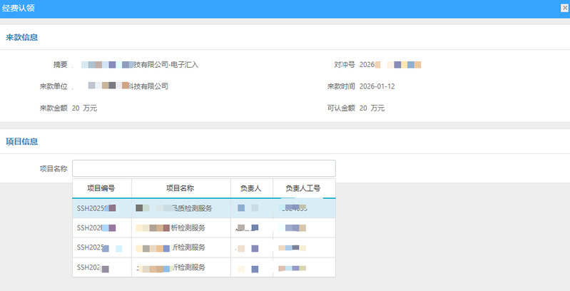 5.根据来款信息选择来款项目,点击项目编号(或输入合同编号)进入下一步。