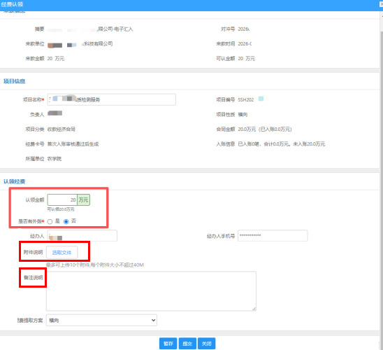 6.输入认领金额,根据合同确认是否有外拨经费。